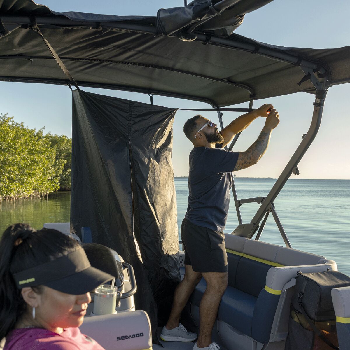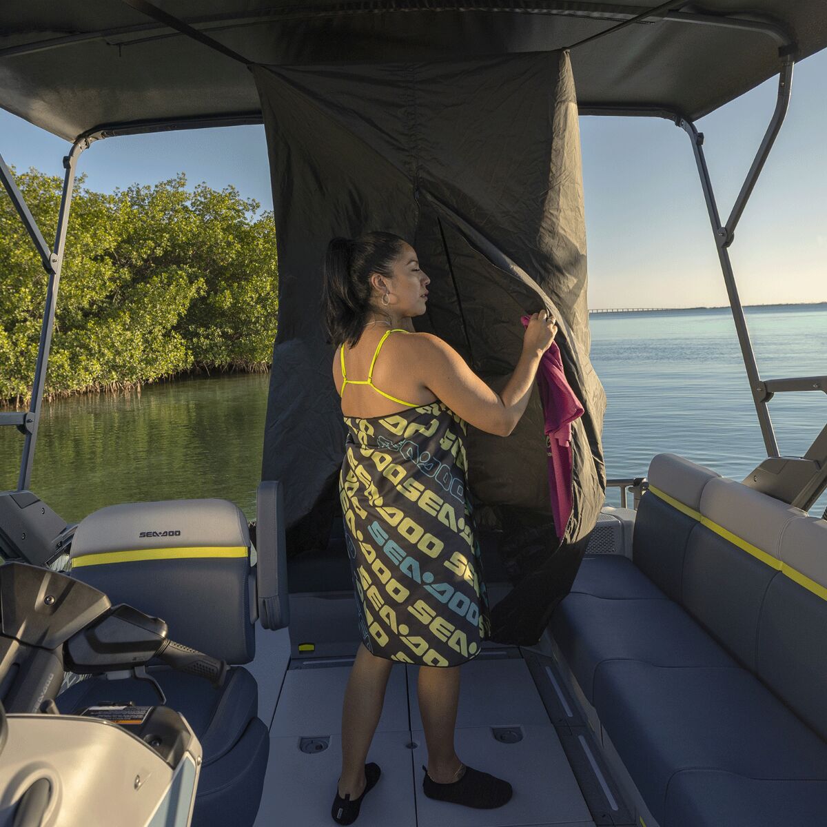 Prolongez vos journées sur l’eau grâce à ce nouvel accessoire pratique. Cet espace privé et toilette d’urgence vous permet de vous changer de vêtements ou d’utiliser la toilette d’urgence en toute discrétion et à l’abri des intempéries. Il s’installe rapidement sur la structure du toit bimini de votre ponton Switch. L’ensemble comprend un rideau d’intimité doté d’une ouverture à glissière pour un accès facile, une toilette d’urgence et un sac de rangement. Il se range facilement dans le compartiment sous les sièges du ponton. C’est l’accessoire essentiel à votre prochaine aventure ! Offre un espace privé pour se changer ou utiliser la toilette d’urgence. Comprend avec un sac de rangement pouvant contenir un rideau d’intimité et une toilette d’urgence. Peut être rapidement installé sur n’importe quelle structure du toit bimini à l’aide de sangles. Ouverture à glissière pour un accès facile. Dimensions lorsqu’ouvert : 76cm L x 76 cm l x 203 cm H (30 po L x 30 po l x 80 po H). Se range facilement dans le compartiment sous les sièges.