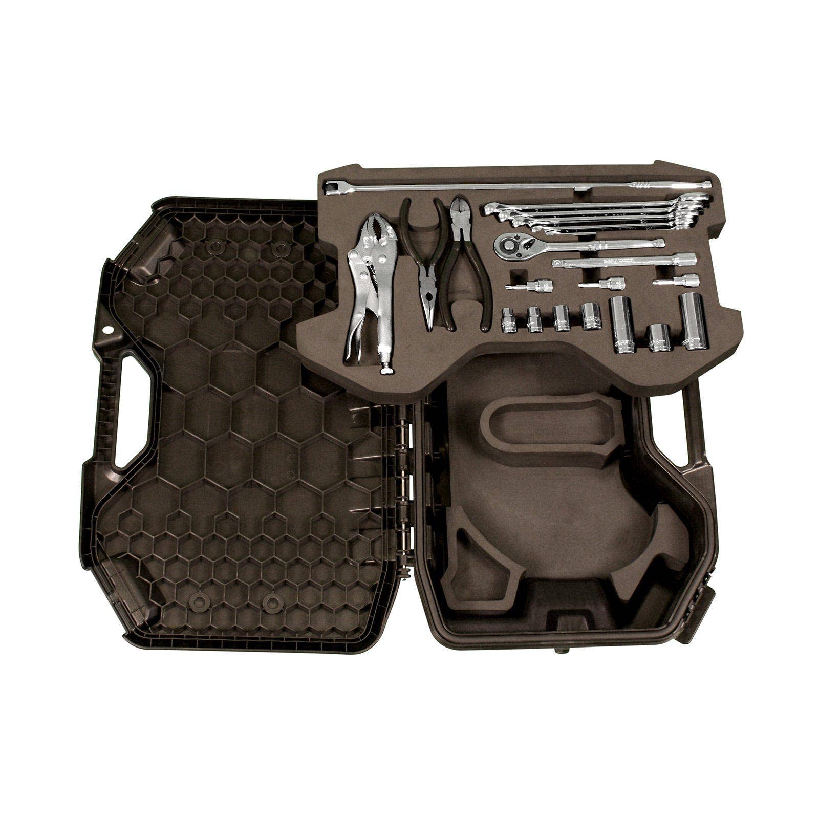 La plupart des conducteurs aiment avoir les outils essentiels pour pouvoir effectuer les réparations les plus courantes. Pour faciliter l’organisation et s’assurer que ces outils essentiels sont toujours à portée de main, Can-Am a créé la trousse à outils la plus polyvalente qui soit. Le système de fixation LinQ permet d’empiler la trousse avec presque tous les accessoires LinQ de 16 pouces. À l’intérieur de la boîte modulaire se trouve une sélection d’outils qui peuvent être utilisés pour n’importe quelle réparation. Changez rapidement un pneu ou une courroie et reprenez la route, car les outils, de la barre de force à la sélection de douilles, sont compatibles avec tous les véhicules Can-Am, et il y a même un emplacement pour une courroie de rechange. Comprend : Pinces coupantes Pinces à long bec Pinces étau Clé à cliquet 3/8 po Extension de cliquet 6 po Douille longue 19 mm 3/8 po – 6pts Douille 18 mm 3/8 po Douille longue 17 mm 3/8 po – 6pts Douille 15 mm 3/8 po Douille 13 mm 3/8 po Douille 10 mm 3/8 po Douille 8 mm 3/8 po Clé combiné 19 mm Clé combiné 18 mm Clé combiné 15 mm Clé combiné 13 mm Clé combiné 10 mm Clé combiné 8 mm Douille torx t40 3/8 po Douille torx t30 3/8 po Douille torx t20 3/8 po Bar de force 3/8 po Espace de rangement intégré pour courroie d’entraînement (courroie non incluse) Vous pouvez laisser les accessoires LinQ sur le véhicule en toute sécurité grâce au verrou LinQ (860201968).