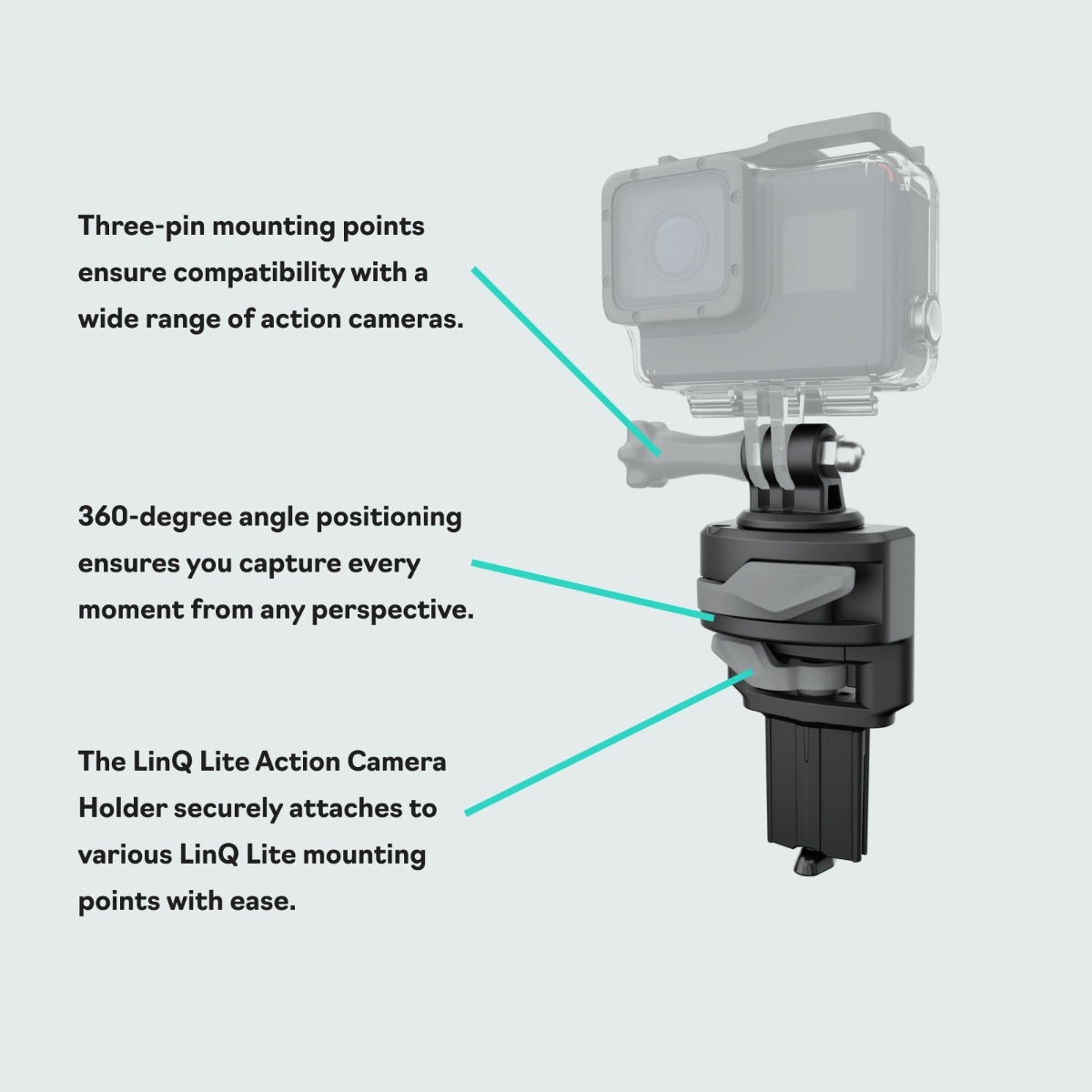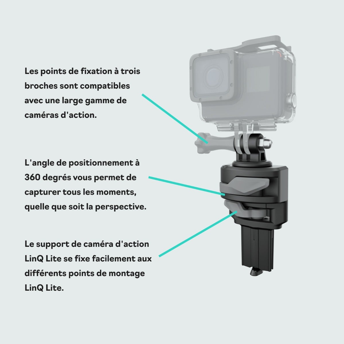 Système de fixation LinQ Lite pour caméras. Permet d’obtenir des points de vue exceptionnels pour capturer des photos et des vidéos. Offre un angle de 360 degrés pour capturer des vidéos et photos parfaites. Conçu pour retenir les appareils solidement. Fixation et retrait rapides et faciles.