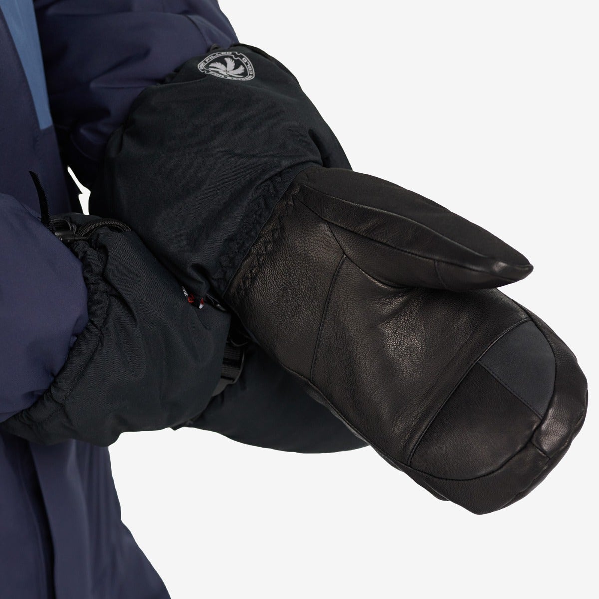 Isolant en plume d’oie éthique Entre-doublure imperméable, respirante et résistante au vent Doublure en laine naturellement respirante et antimicrobienne Paumes et doigts renforcés en cuir Propriétés tactiles à l’index Essuie-nez au pouce